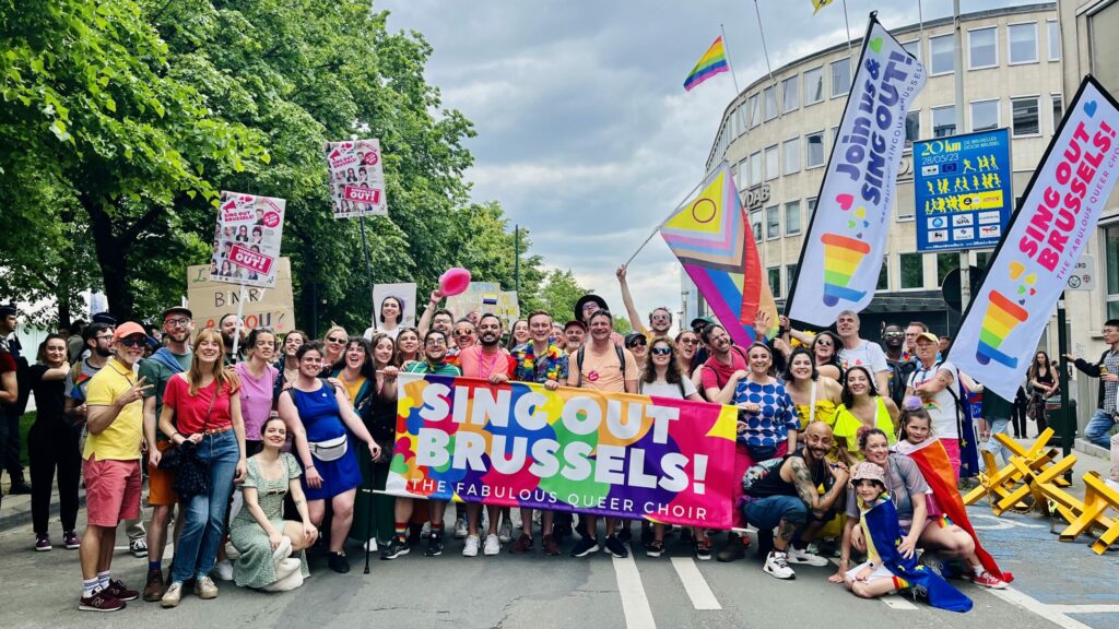 Sing Out Brussels! is a community choir that welcomes each member while respecting their identity, in an atmosphere marked by the joy of being together, pride and generosity of spirit. Our members reflect the diversity of the LGBTQI+ community in Brussels, with over 20 different nationalities and 15 languages spoken.